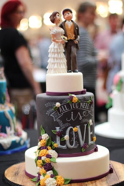 A wedding cake is the traditional cake served at wedding receptions following dinner. In some parts of England, the wedding cake is served at a wedding breakfast, note that ‘wedding breakfast’ does not mean the meal will be held in the morning but at a time following the ceremony on the same day. In modern Western culture, the cake is usually on display and served to guests at the reception. Traditionally, wedding cakes were made to bring good luck to all guests and the couple. Modernly however, they are more of a centerpiece to the wedding and are not always even served to the guests. Some cakes are built with only a single edible tier for the bride and groom to share.